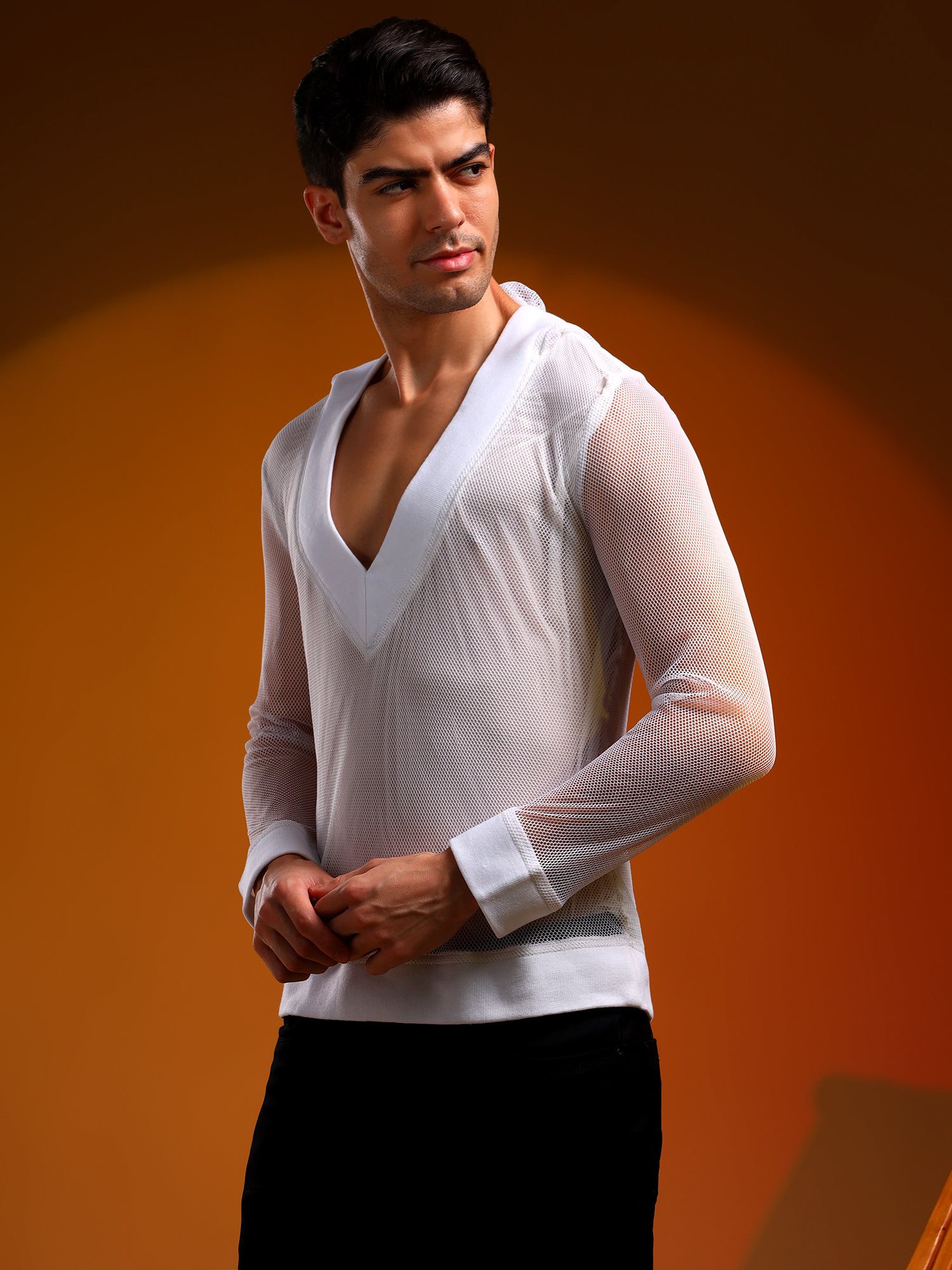 Full-sleeved, Double layered White Net and Power Net Hoodie styled with Ribs